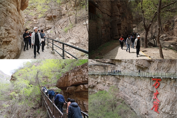 參觀活動結束后,大家開始游覽京東大峽谷,沿著崎嶇的山路,欣賞大峽谷鬼斧神工的自然景觀。漫步于美麗的龍門湖,看群峰倒映水中;依崖而建的人工棧道,猶如攀巖在懸崖峭壁上,大家身臨其境,感受當年軍民抗日的艱難險境;天然形成的五龍?zhí)丢毦犹厣?,有的深不可測,有的靜若處子,有的湍瀉奔流,為大峽谷增添了靈氣。大家在曲折陡峭的山路中穿行,互相鼓勵,相互扶持,順利通過。一路游覽,一路暢談,一路體驗,大家感受到了自然風光的美麗和今日生活的美好。